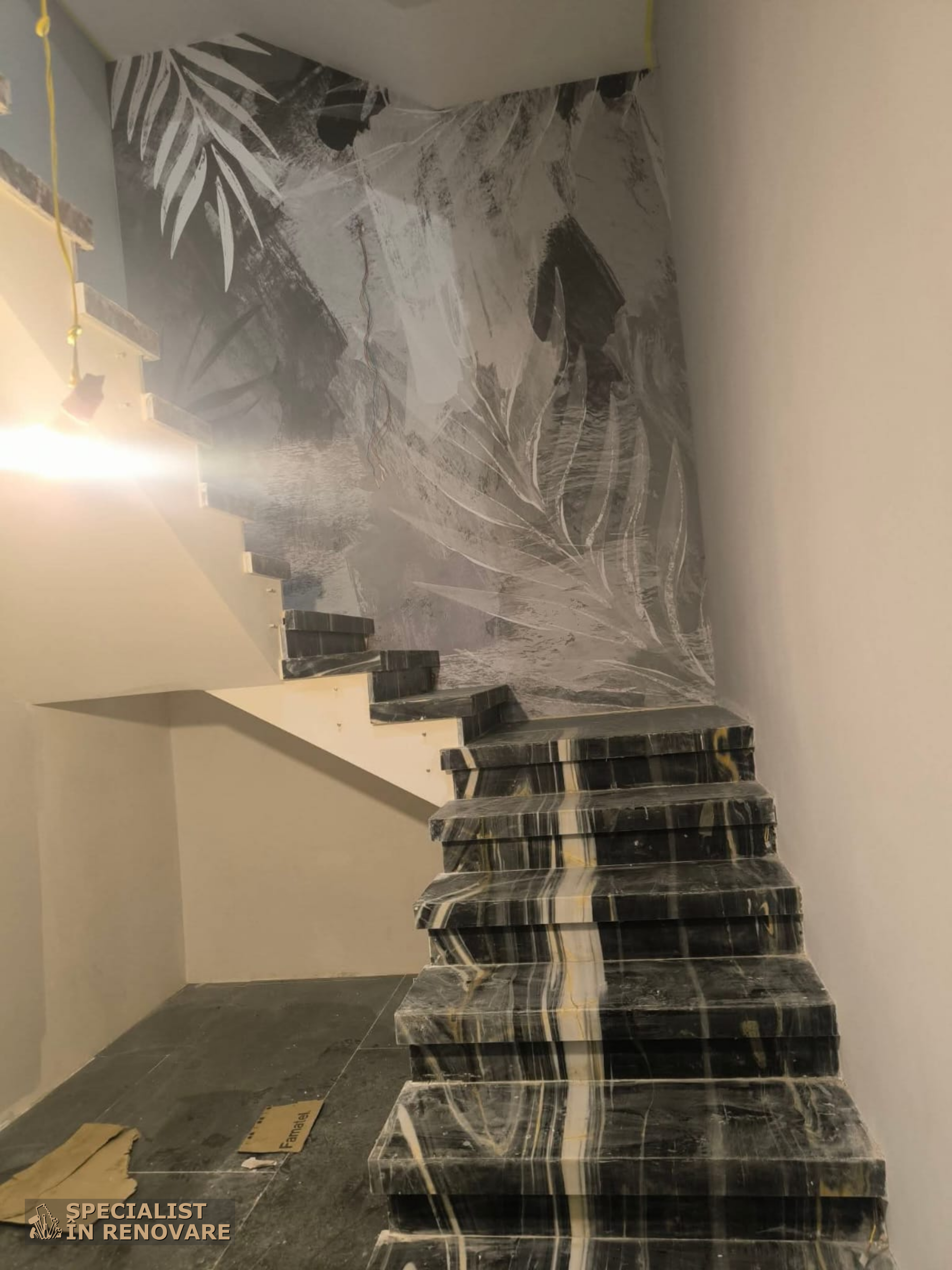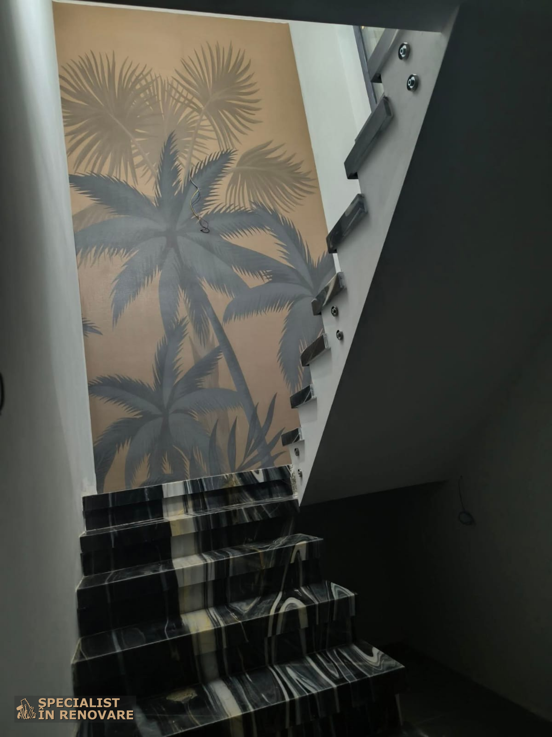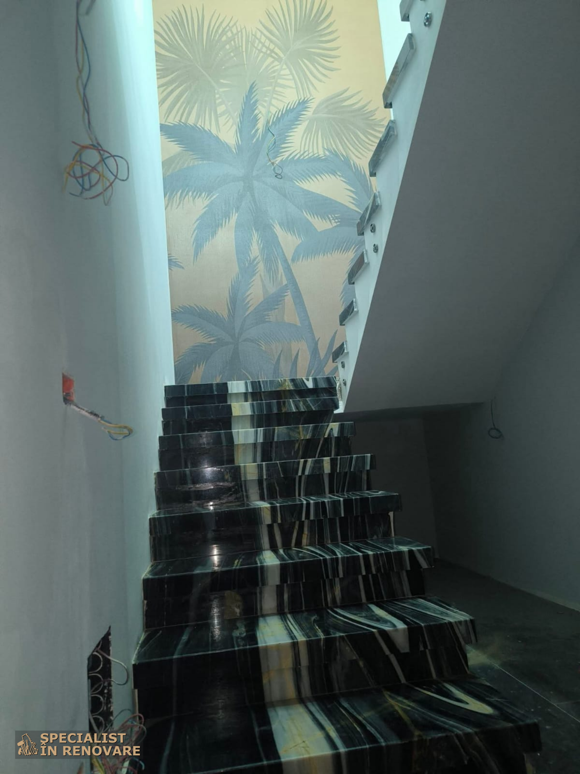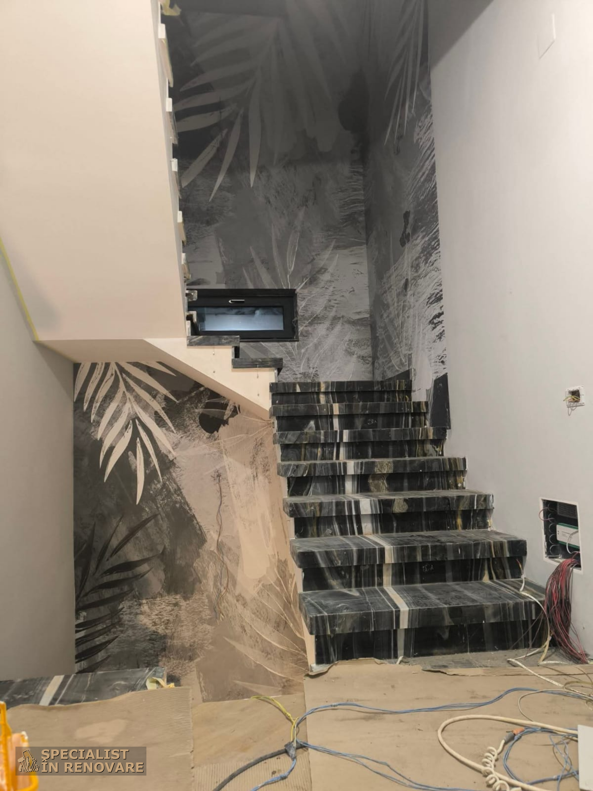 Lucrarea finala este un exemplu de design inteligent si maiestrie impecabila. Marmura neagra, cu venele sale dramatice, face ca scara sa fie un punct de atractie luxos. Elementele botanice de pe perete adauga profunzime si echilibru.