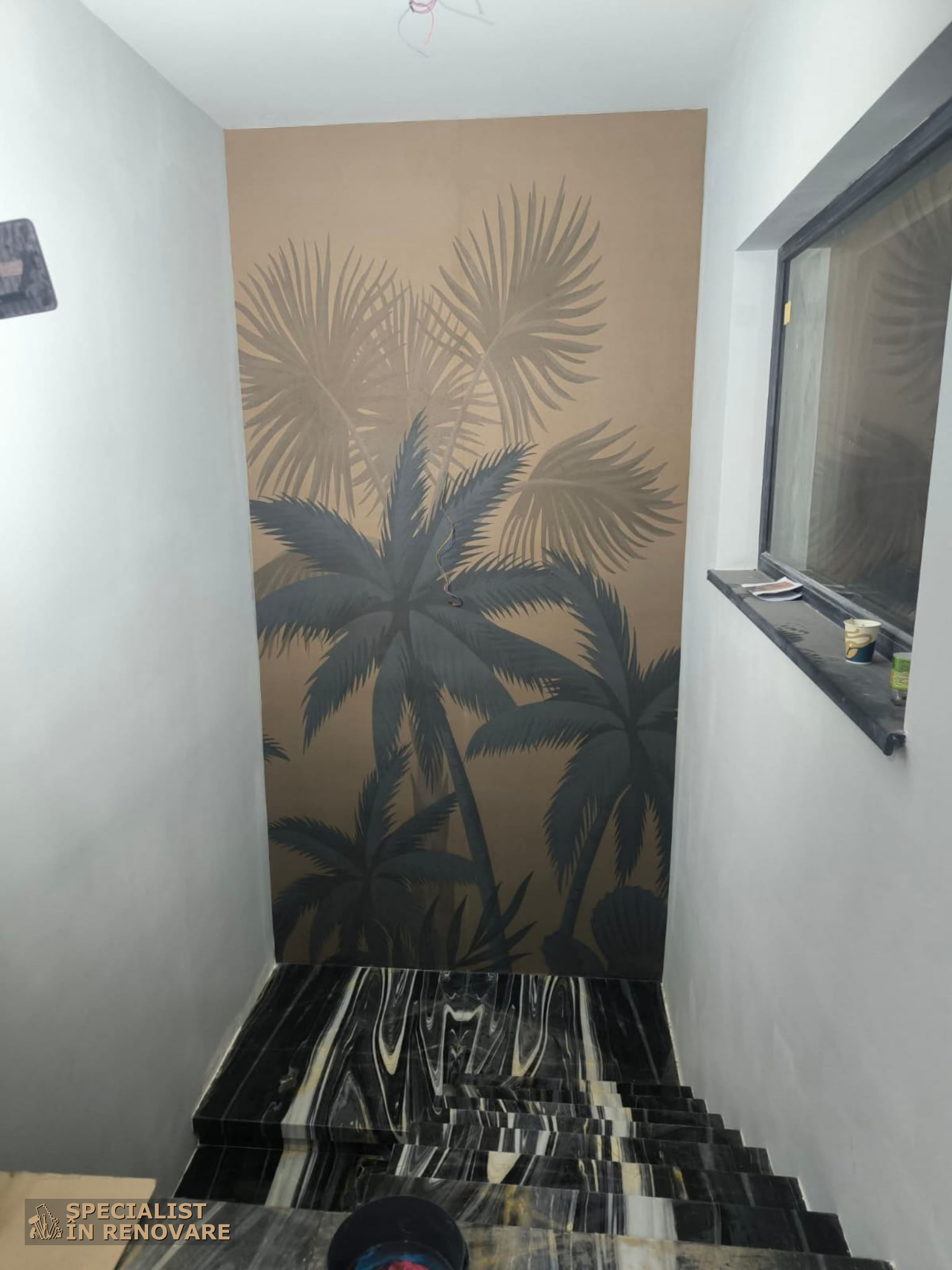 Montajul tapetului a fost, de asemenea, o provocare. Modelul frunzelor trebuia sa fie impecabil aliniat. Datorita experientei si atentiei la detalii, echipa noastra a depasit toate dificultatile si a obtinut un rezultat perfect.