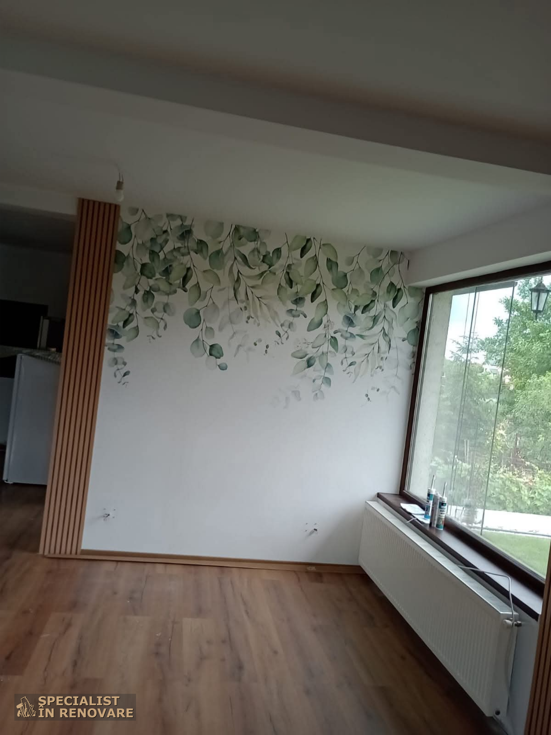Peretii au fost tratati cu vopsea alba neteda si un mural cu motive botanice. Aceasta combinatie adauga un plus de stil, mentinand totodata un aspect simplu. Am folosit o vopsea fara compusi organici volatili (VOC) pentru un mediu sanatos. Muralul a fost ales special pentru a crea un punct focal relaxant. Materialul folosit este un vinil ecologic, rezistent la decolorare, aplicat cu atentie.